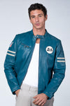Ocean blue racing style leather jacket with biker collar - Image n°1