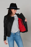 De kraag is typisch voor de motorrijder, met een drukknoopsluiting. Het model maakt indruk op ons door zijn asymmetrische sluiting met een stijlvol design. De huid van het leer onthult in elkaar grijpende patronen die getuigen van de knowhow van een merk dat wordt beschouwd als een belangrijke speler in leer. Aan de voorkant zijn drie zakken met ritssluiting zichtbaar. Een andere is aanwezig in de ultrachique felrode voering, om aan je opbergbehoeften te voldoen. Wij waarderen het zorgvuldige werk dat erin zit. uitgevoerd op de naden en doorgestikte stiksels om een onberispelijke afwerking te verkrijgen.