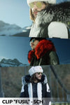 Vaste capuchon met trekkoord, versierd met afneembaar wasbeerbont met drukknopen.