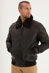 Black thick leather bomber jacket with fur collar - Image n°1