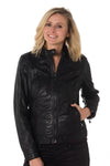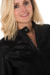 De TRANI BLACK is een jas met bikerkraag, speciaal bedacht en uitgevoerd voor vrouwen met royale vormen.
