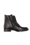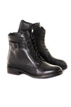 Uniform in de zwarte kleur sluiten deze laarzen aan de voorkant. aan de voorkant door veters in metalen oogjes. Een ritssluiting. De glijbaan is ook aan de zijkant geplateerd. links als extra, terwijl aan de rechterkant een riempje met gesp aanwezig is. De naam van het merk is geflockt; net boven de hiel, aan de zijkant van de hiel. rechts.