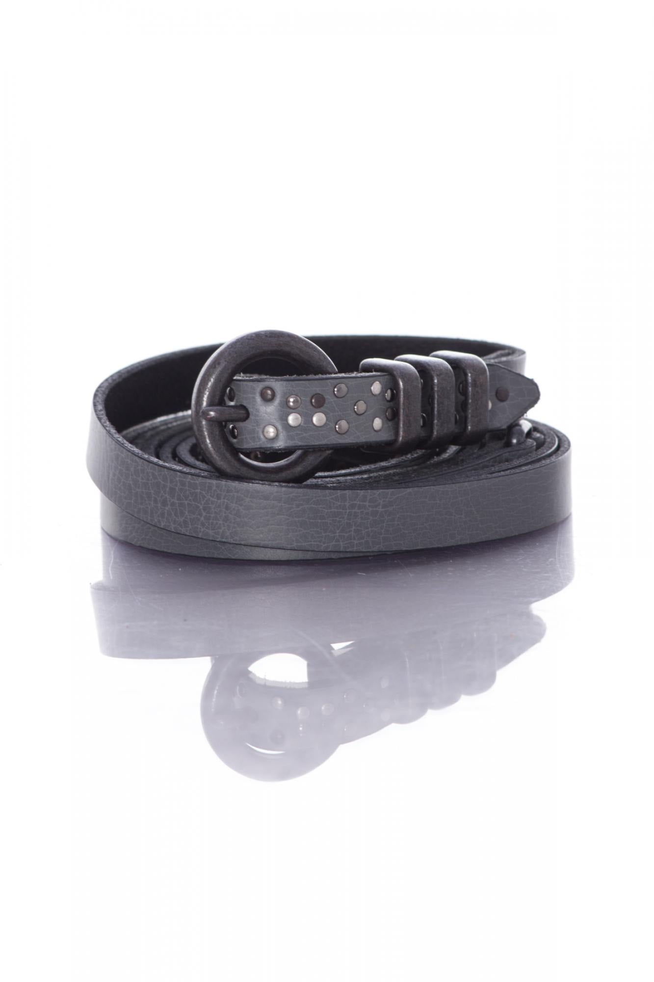 Dit model in grijs leer versierd met studs is zeer origineel omdat je hiermee 2 taillelijnen kunt maken.