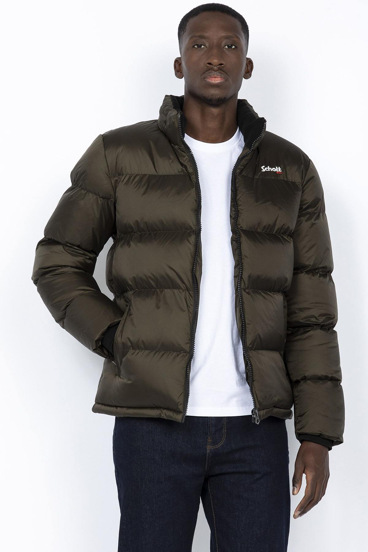 De IDAHO KAKI herenjas van het merk Schott is een donsjack gemaakt van kakikleurig nylon. Het is een jas geschikt voor herfst en winter.