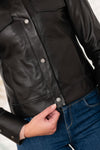 Women's short jacket in thin and light black leather with shirt collar - Image n°1