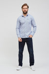 Dit blauwe overhemd heeft een enkele knoopsluiting waar witte knopen zichtbaar in zijn. De mooie print in donkerblauw tegelpatroon geeft het geheel een zekere charme. Aan de zijkant is een zak geplaatst. links van de borst en daar staat het kleine logo van het merk.