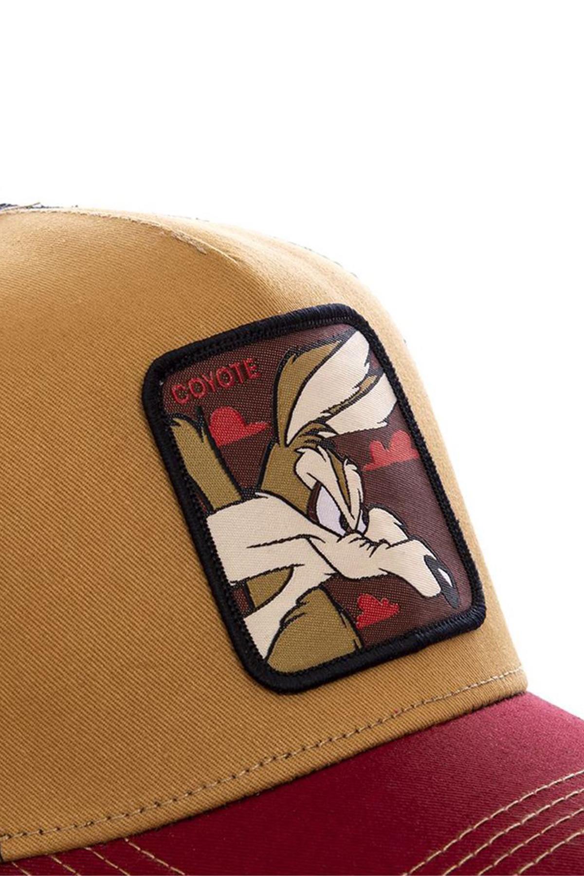 Je zult Coyote, de slechterik uit Looney Tunes, zeker herkennen. Zijn afbeelding is op de voorkant van de dop geplakt. De beige kleur past bij de stijl. verbaas je over de rode kleur van het gebogen vizier. Deze laatste is licht gebogen en versierd met beige stiksels. De mesh-kroon is zwart en heeft een merkmedaillon aan de zijkant. links.