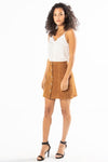 De kastanjebruine kleur is erg mooi en geeft je de mogelijkheid om deze rok te combineren met een witte of roze blouse die zijn glans en schoonheid naar voren zal brengen; Probeer pumps voor een verfijnde look. en laarzen vergezeld van een bijpassend leren jasje zodat je kleine ‘ernaast outlaw’ kan zijn.