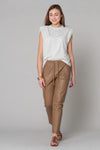 Deze broek heeft een elastische taille, versterkt door een trekkoord, en twee raglanzakken aan elke kant van de tailleband. en twee paspelzakken aan de achterkant. de achterkant. Dit geeft een mooie afwerking en accentueert je billen. De naad op de knieën zorgt voor een goede stabiliteit. het oppervlak van deze broek is beperkt tot net boven de enkels.