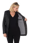 Zeer soepel zwart schapenleer en zwart-wit gestreepte polyester voering.