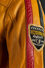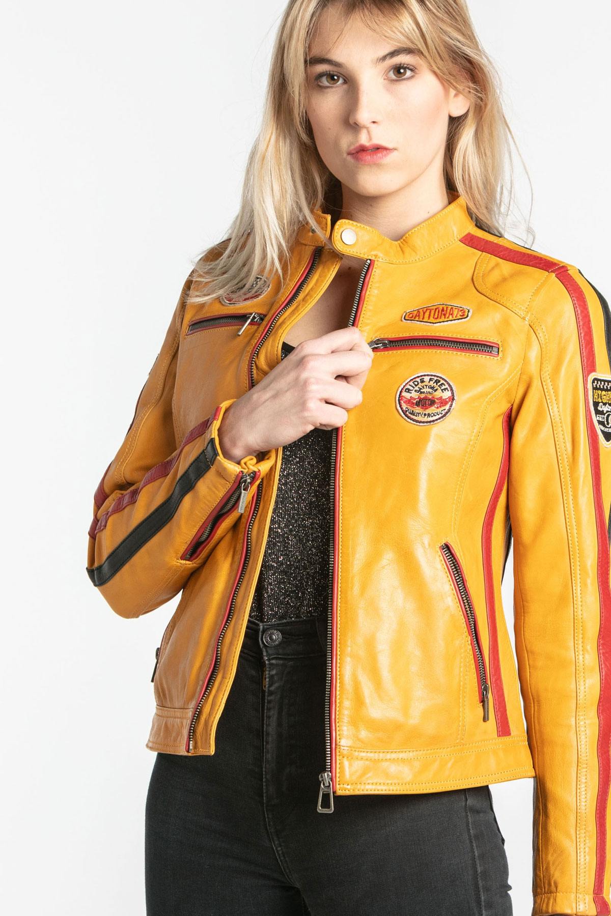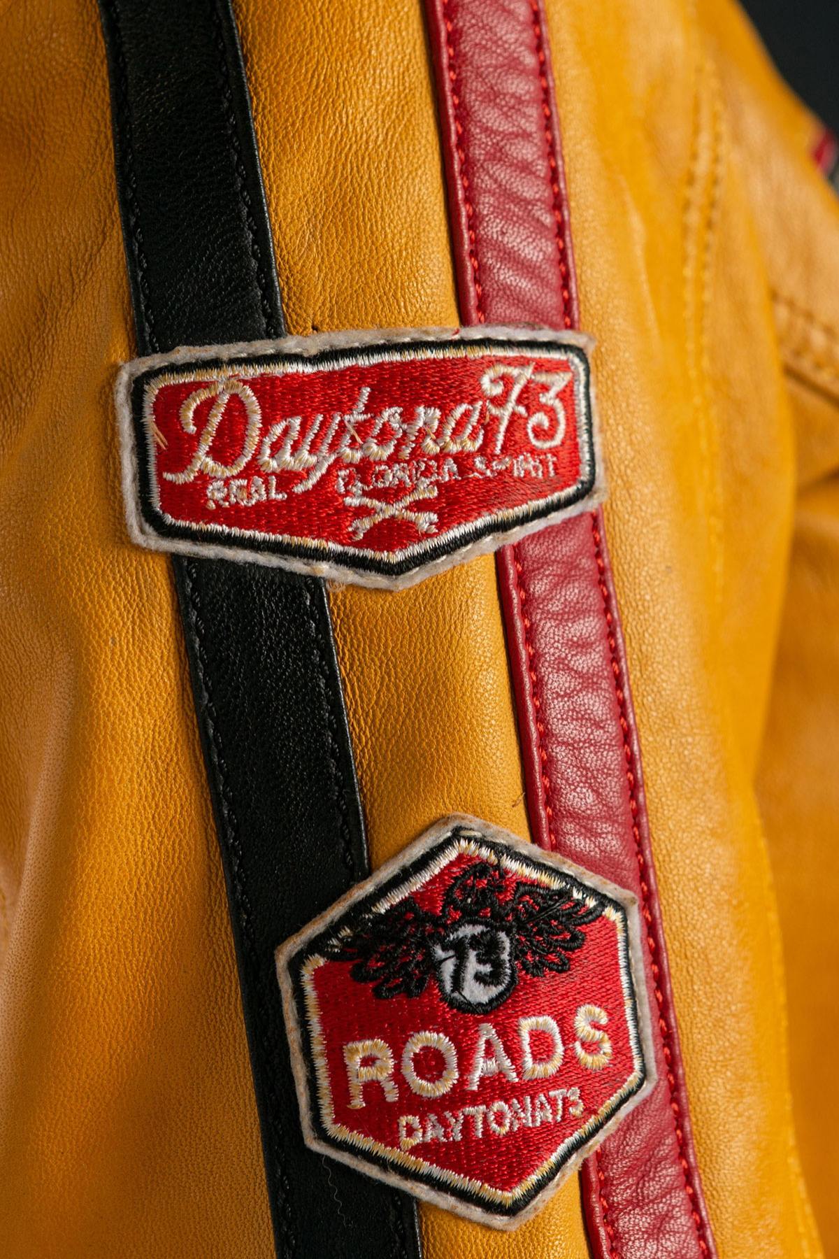 Als de gele kleur met rode en zwarte strepen je niet meteen verleidt, zal de zachtheid van het leer dat wel doen. Met zijn mandarijnkraag voorzien van een riempje met drukknoop, sluit dit jasje in de as met een lange metalen ritssluiting. Het uiteinde De lange mouwen zijn voorzien van een ritssluiting en doen denken aan een optreden. Op de borst zijn twee zakken met ritssluiting geplaatst, evenals twee andere zijzakken. De groene binnenvoering is comfortabel en heeft een ritsvak. En om al zijn originaliteit te benadrukken; en met respect voor zijn traditie heeft Daytona talloze mechanische badges in sportstijl op de mouwen, borst en rug aangepakt.