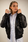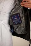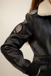 Trouw aan ons merk. In navolging van de traditie van de beroemde bomberjacks heeft dit zwarte jack een lange metalen axiale ritssluiting en geribde banden aan de onderkant en de uiteinden van de lange mouwen. De grote overhemdkraag is versierd met afneembaar wit imitatieschapenbont. De vier zijzakken. En hoe kunnen we de Patrouille de France-badge vergeten? Hij is aan de zijkant van de rechtermouw geplateerd.