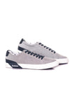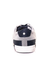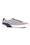 We merken meteen de onstuitbare associatie tussen grijs en marineblauw, de kracht van dit stadsmodel, helemaal in de tijdsgeest. Het is een lage schoen met een platte hak, voorzien van een elastomeer buitenzool. Het bovenwerk is gemaakt van gemêleerd textiel. grijs, met stijlvolle marineblauwe inzetstukken. We houden van de platte vetersluiting die door de zilveren metalen oogjes met merklogo loopt. Het ton-sur-ton genaaide zijlogo is ook een onbetwistbaar sterk punt.