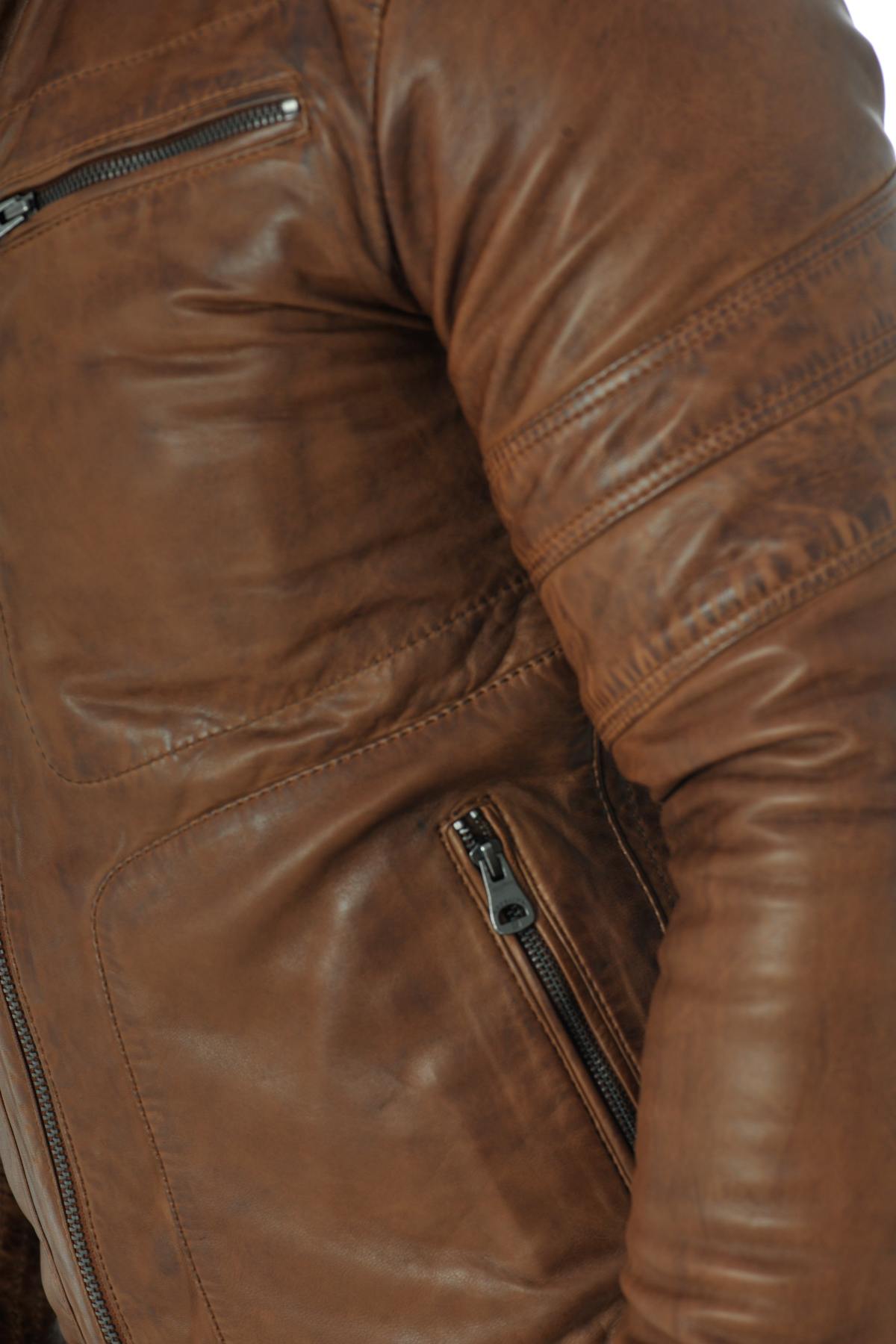Cognac sheepskin leather biker collar jacket - Image n°5
