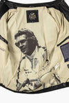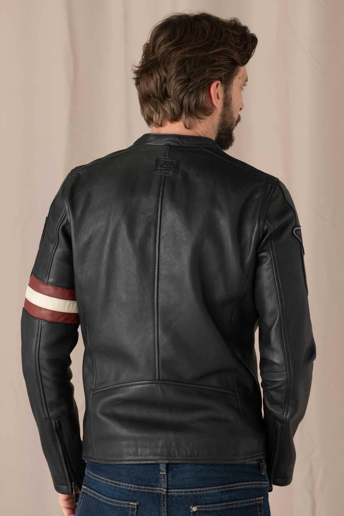 De Gary Sheep Crown Black jas van Classic Legend Motors is gemaakt van hoogwaardig zwart schapenleer en biedt een gladde uitstraling en uitzonderlijke duurzaamheid. Dit model heeft een bikerkraag met drukknoopsluiting en valt op door de horizontale witte en rode strepen op de linkerarm, die een vleugje dynamiek toevoegen. Het heeft drie buitenzakken met ritssluiting (twee zij- en één borst) en twee binnenzakken voor optimale opslag. De verschillende "Steve McQueen" patches in marineblauw, gelegen op de borst en mouwen, versterken de authenticiteit van de jas. Het beige katoenen interieur, versierd met een fotoprint van Steve McQueen, maakt dit unieke ontwerp compleet. De slimfit snit zorgt voor een getailleerd en modern silhouet.