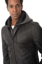 Tweekleurige zwarte en grijze afneembare capuchon gemonteerd op een afneembare ritssluiting.