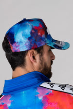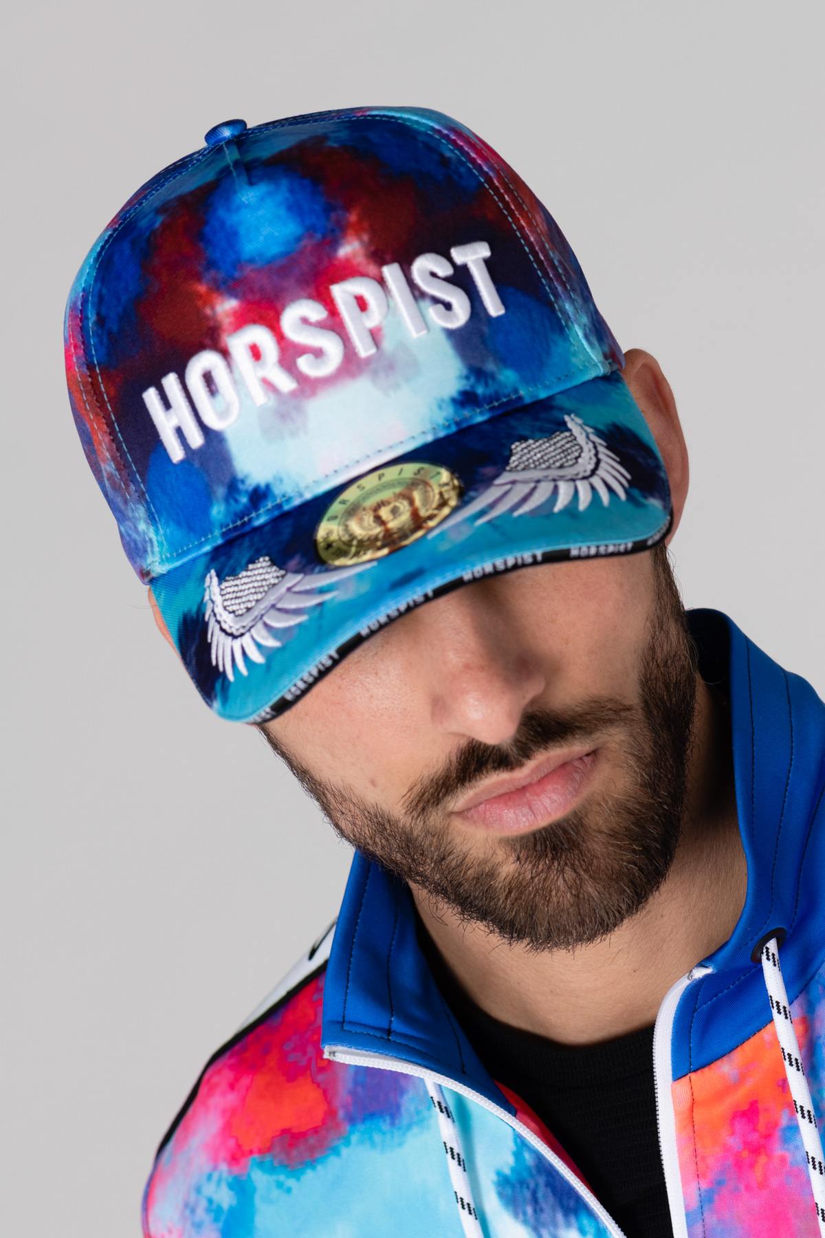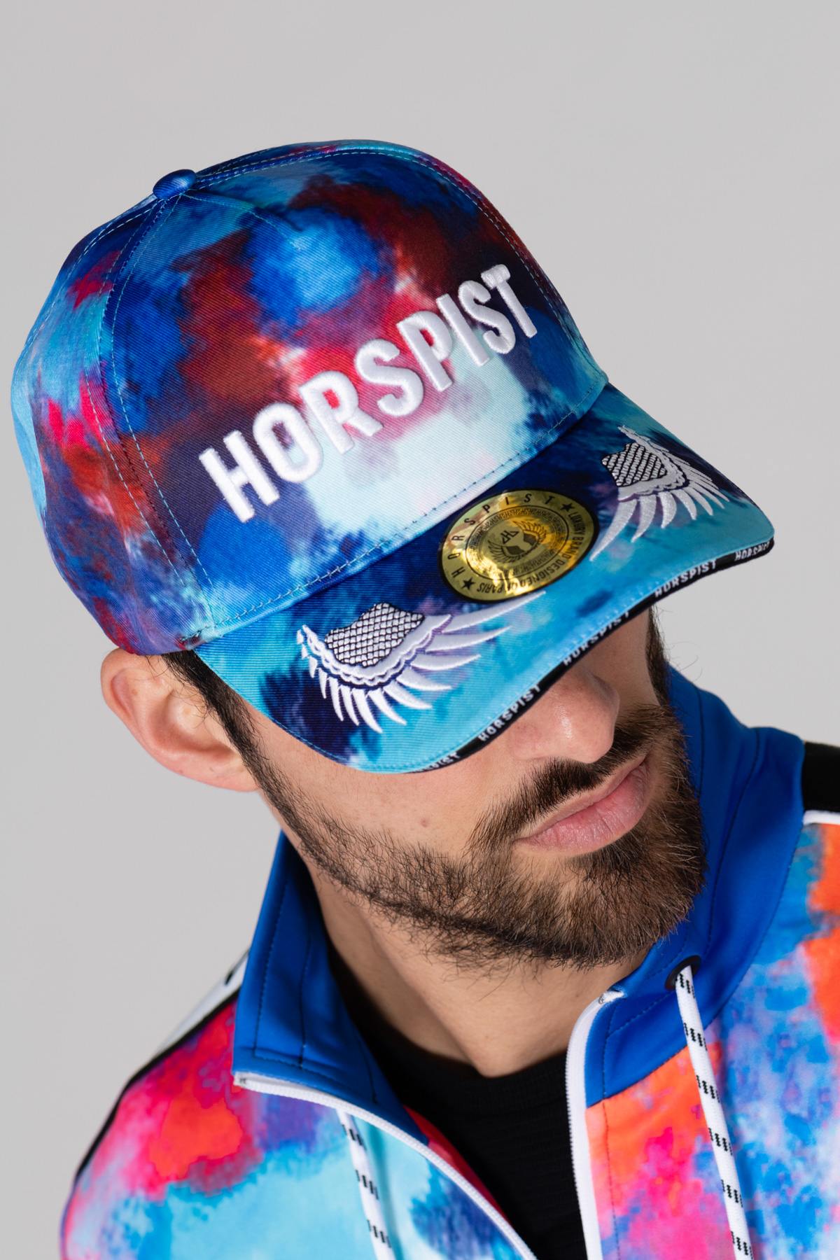De blauwe kleur wordt gedegradeerd door de print. overal gecombineerd met rode, witte en roze kleuren, wat het een prachtige afwerking geeft. De zwarte plastic sluiting is aan de voorkant genaaid. Dankzij de achterkant kun je deze pet aanpassen aan je hoofdomvang. De merknaam is geborduurd. reliëf op de voorkant en ook weergegeven op het gouden medaillon op de klep. De witte vleugels zijn op het vizier geborduurd en het woord Horspist is erop gedrukt. filigraan op de rand van het vizier markeert de originaliteit van dit product. van dit accessoire.