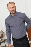 Dit overhemd is blauw van kleur en is verfraaid met all-over vlokken die kleine rode cirkelvormige patronen benadrukken. Rood zoals het geborduurde merklogo. aan de zijkant linkerborst. Bijpassende knopen bevestigen dit overhemd aan een enkele knoopsluiting. Ook de uiteinden van de lange mouwen zijn afsluitbaar. door deze knopen te gebruiken.