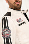 This jacket with its inimitable finishes clearly illustrates the ability to wear clothing. Daytona products renewing itself season after season. A true work of art, this model immerses us in biker style and legendary car racing circuits. The sheepskin leather construction is enhanced by black inserts which bring the general white color to life. The quilting on the shoulders and the contrasting bands along the sleeves are all reasons to fall for this unique piece. Its numerous embroidered patches give a mechanical note popular with speed enthusiasts. The mandarin collar comes down to a black zipped closure, accompanied by chest pockets and hand pockets all at the front. zip. Additional pockets incorporate the lightweight, comfortable lining.