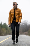 Bold and stylish, the DAYTONA GOLD jacket by Master is designed for men seeking a distinctive look. Crafted from golden yellow cowhide leather, it brings a vibrant and original touch to your wardrobe, perfect for year-round wear.