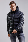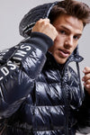 In its black color, its surface is shiny. It closes with a long metal zip that goes up to the high collar. The latter is equipped with a large hood with drawstring. The long sleeves are decorated with a band printed with the brand name and they end with an elastic ribbed band which ensures a better fit.