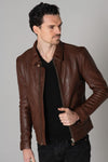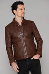 The Norris Green Brown has a regular cut. The skin has an aged and mottled appearance. The thickness of the leather provides good support to the shoulders. The central zip and sleeves have a worn, slightly golden color. The pockets have a snap. The lining is lightly padded.