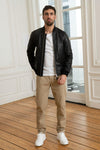 Discover the Teddy jacket for men, the LCBOMB BLACK from Schott, which combines the finesse of lambskin with an elegant and sporty style. This versatile garment, ideal for all seasons, seduces with its slimfit cut and its timeless smooth black appearance.