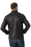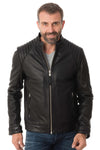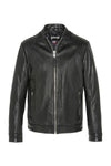 The LCJULES BLACK is a biker style jacket characterized by by its round collar and its quilting at the shoulders.