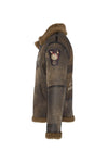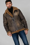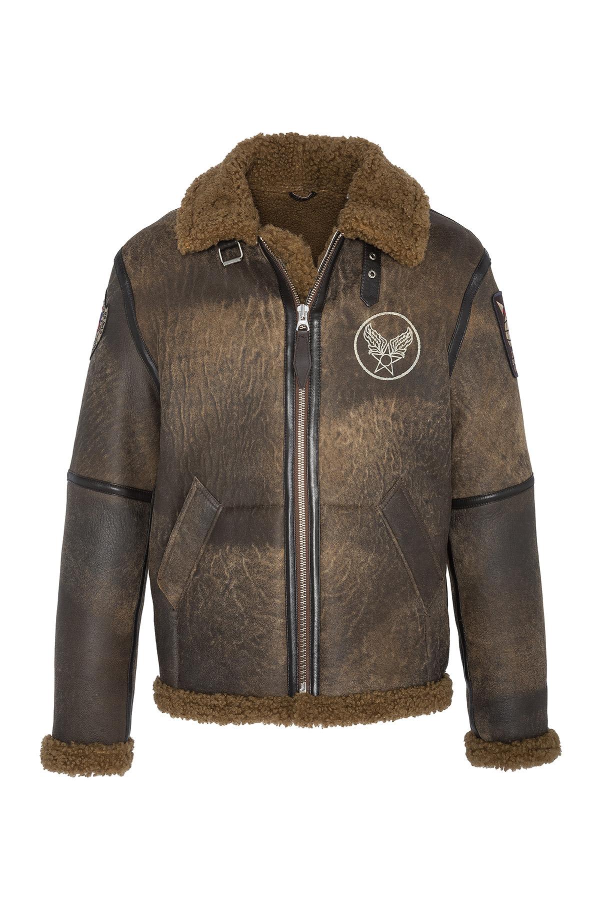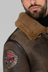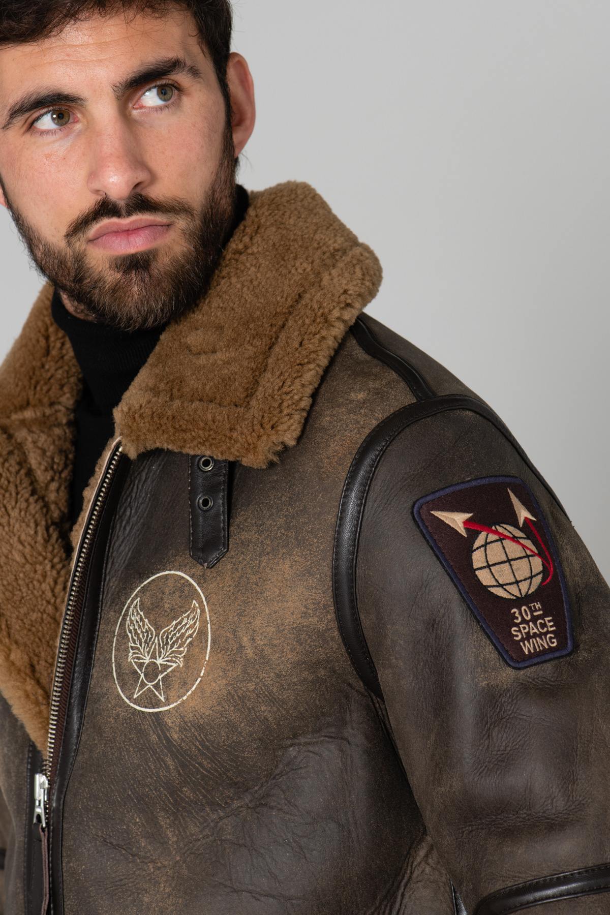 Its aged texture is very successful and matches any room style. marvel with the wool placed on the belt, the ends of the long sleeves and the neckline. The collar is equipped with It has a strap with a metal buckle and the main part closes with a long axial metal zip. Two large side pockets are present on each side. To be faithful to the bomber jacket from the Great War era, patches are stuck on each shoulder, on the chest and large format on the back.
