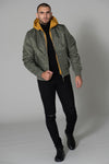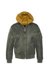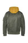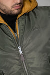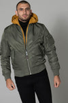 The collar, cuffs and waist are made to measure. Ribbed edges. A detachable hood in a wise color harmonizes with the general khaki color of the bomber. It is equipped with a drawstring with stopper. The jacket has a central zip fastening on the front, with two slanted pockets on the sides. Pressed flaps that will keep your hands warm. A zipped pocket on the left arm reinforces the military trend of the garment.