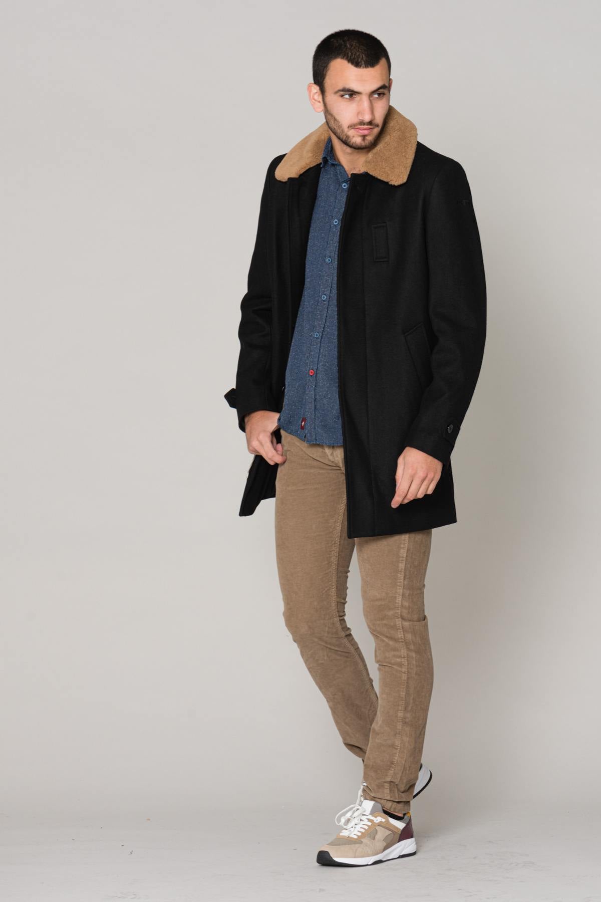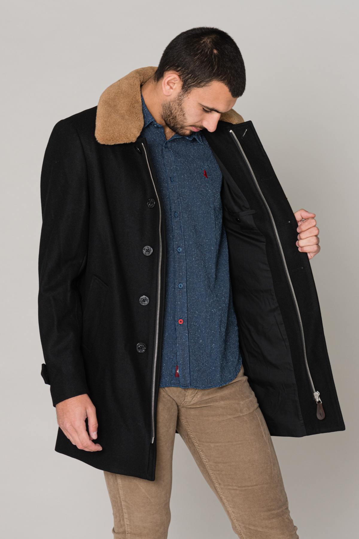 Removable acrylic fur collar with buttons leaving room for the zipper. a shirt collar.
