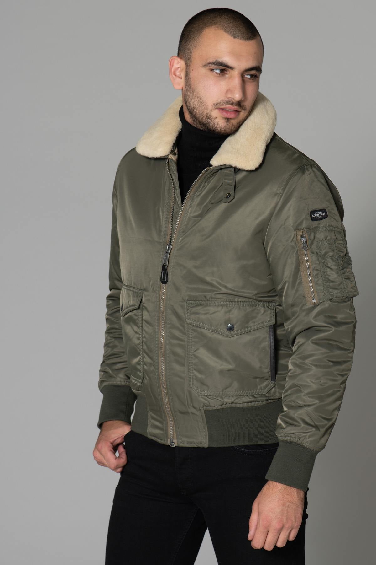 Khaki pilot jacket with beige fur-lined collar - Image n°1