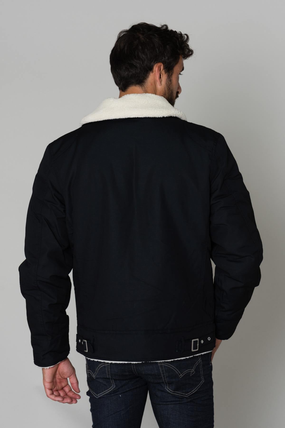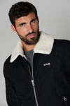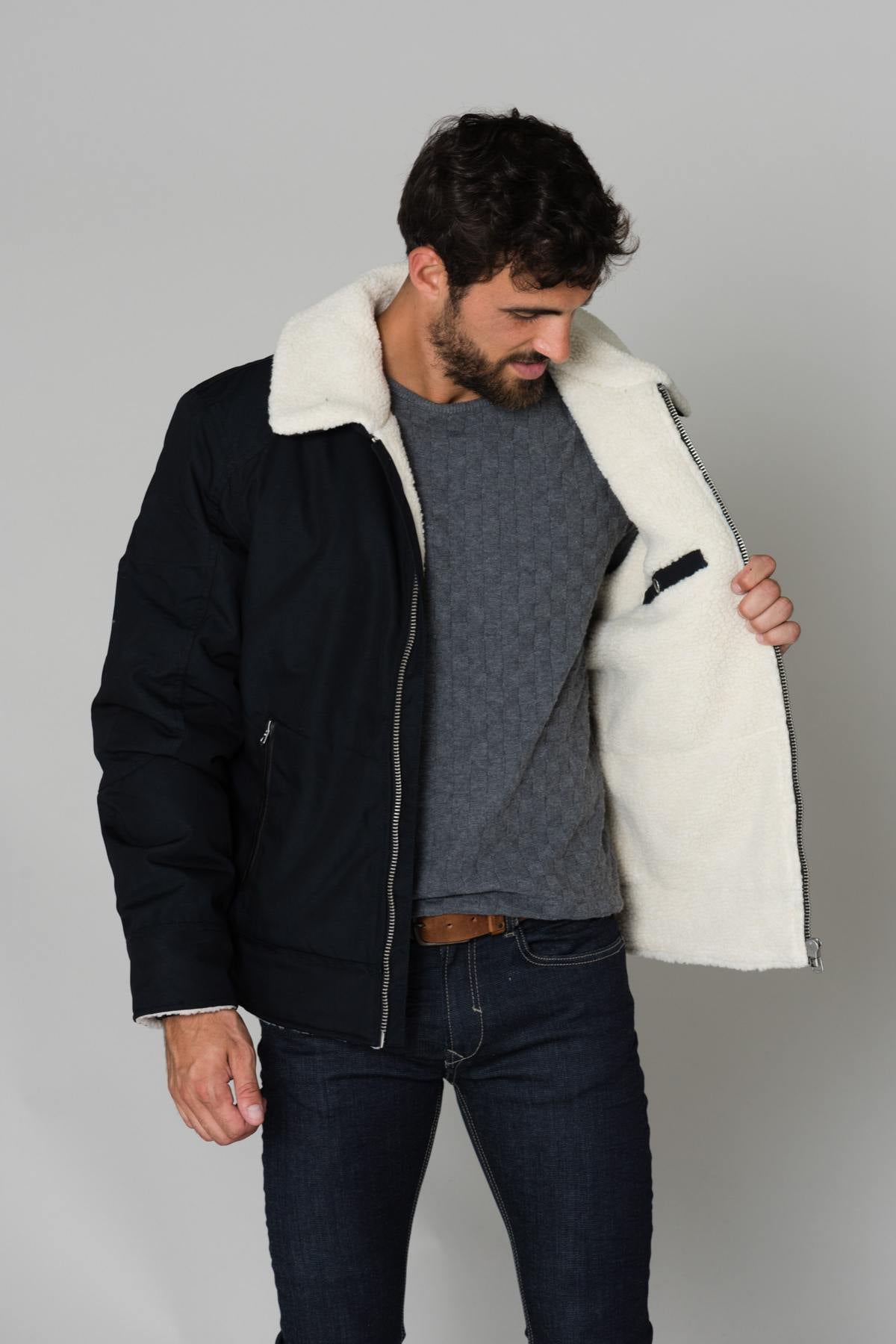The OKLA NAVY is a polyester and cotton jacket with a sherpa lining and collar.