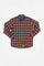 Orange in color, its tile patterns are blue with white lines. The single button placket is flocked. just at the bottom by the brand logo. The reverse of the collar as well as the long sleeves is decorated with by a fancy blue color. The bottom of this shirt is slightly rounded on the sides.