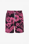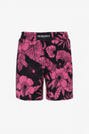 Its waist is elastic and also features a white drawstring matching the side bands printed with the brand's logo. The entire surface is flocked with a pink floral pattern which adorns the whole surface. The black color of these shorts is wonderful.