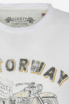 The model is entirely made from scratch. à cotton base. We find a pure crew neck. accompanied men's short sleeves. The collar, sleeves and base of the t-shirt are designed to withstand wear and tear. multiple washes without twisting. A beautiful graphic is present on the bust, featuring a comic strip version of a winged motorcycle, which imposes the identity of the rider. and the American culture of the model. A printed form logo with the interior marks the authenticity of the product. of the model, while a label hangs the t-shirt on the side.