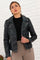 Women's distressed denim blue leather jacket with asymmetrical collar - Image n°4