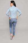 Light blue in color, this jacket is equipped with a slim fit. a biker collar with its adjustable strap. snap button which gives birth to; a long axial metal zip which ensures closure. The waist also has a buckle strap. snap button. The shoulders are padded and the sides are decorated with two vertical zipped pockets. The ends of the long sleeves are also zipped and reinforced with snap buttons.
