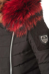 En superb fast huva prydd med majestätisk äkta tvättbjörnspäls som kan tas bort med tryckknappar, med en färgglad touch.