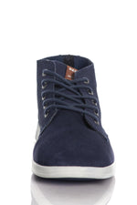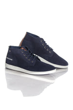Ovandel i mockaskinn. marinblå förstärkt med ett brunt inlägg på baksidan av modellen.