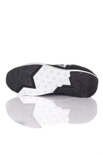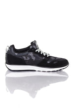 Dessa sneakers i två material: tryckt textil; kamouflage och svart mocka vilar på en stor vit elastomersula.