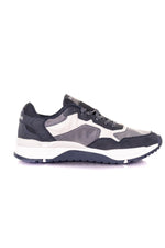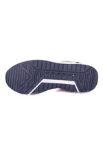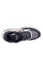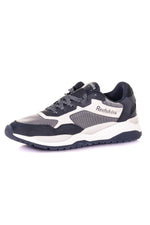 Vi hittar flerfärgade sneakers som spelar på marinblått, grått och vitt. Grå utgör vanligtvis den andningsbara meshtextildelen av skon. De marinblå inläggen är gjorda av slätt nubuckläder. Snörena är platta och gjorda av ljungat tyg. väl förankrad i helhetens chica design. De tjocka hälarna gör dem till wedge sneakers, med en skårad yttersula. Logotypen är tryckt på sidan, disken, plösen och innersulan.