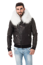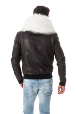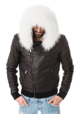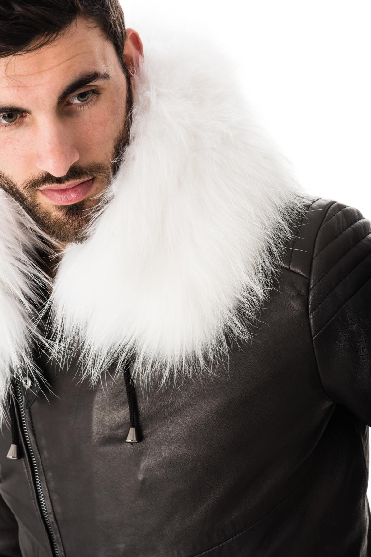 Fast läderhuva med dragsko prydd med magnifik avtagbar päls med tryckknappar.