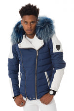 Denna blå polyamidjacka är prydd med inlägg i vitt lammskinn.