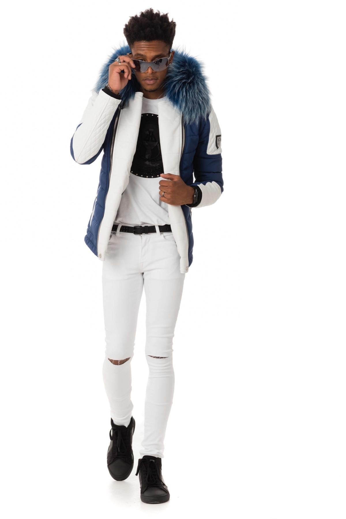 Du kommer att uppskatta dess mycket trendiga slimfit-snitt och du kommer oundvikligen att ge efter för dess sublima, mycket originella blå tvättbjörnspäls som gränsar till huvan.