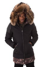 Fast camo-huva med utsmyckning. e av tät naturlig tvättbjörnspäls avtagbar med tryckknappar.