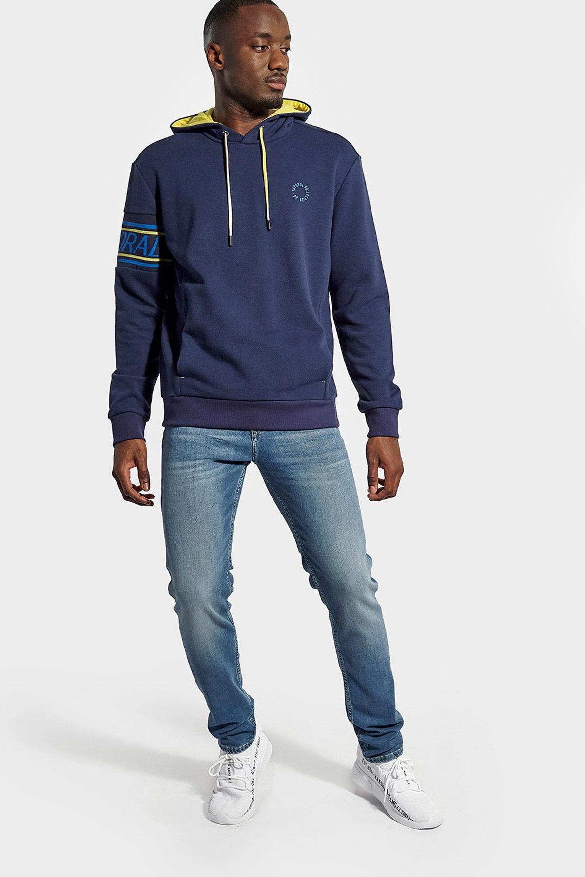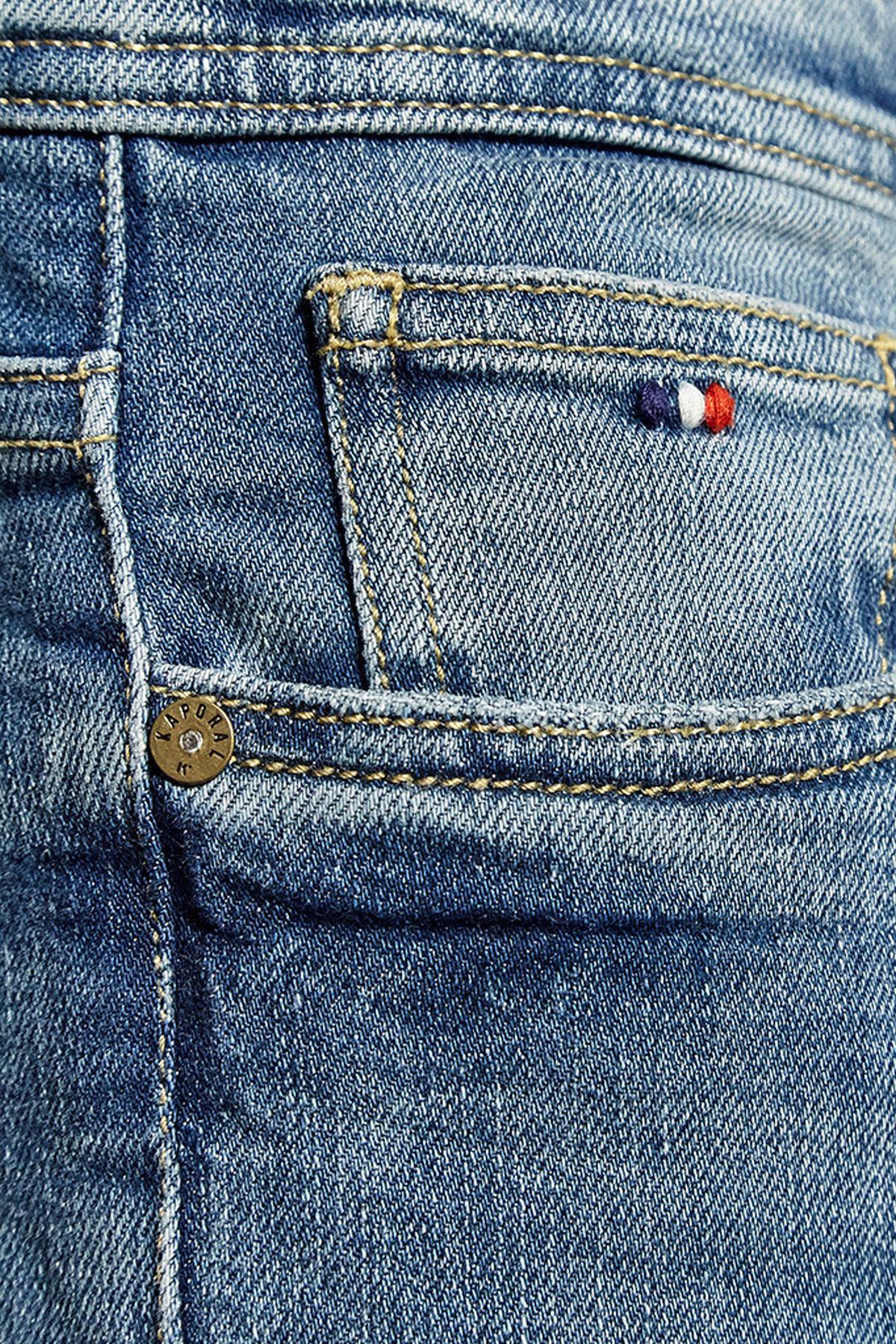 Darko Fripe är visuellt på punkt. Den ger dig en antagen maskulin look, med sitt fördelaktiga snitt och sin bleka blå. väldigt rakt på sak. Den har en dragkedja, med märkesknapp. genom gravering. Det finns fem fickor. Två till en framtill plus en framtill broderad kil på det trefärgade märket, samt två på baksidan märkta med mörkblå sömmar. synlig i snygga trippelhänder. Vi hittar också en märkeslogotyp på luckan på förslutningen och pläterad med den. à bak i midjan.