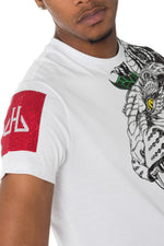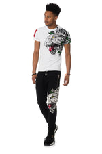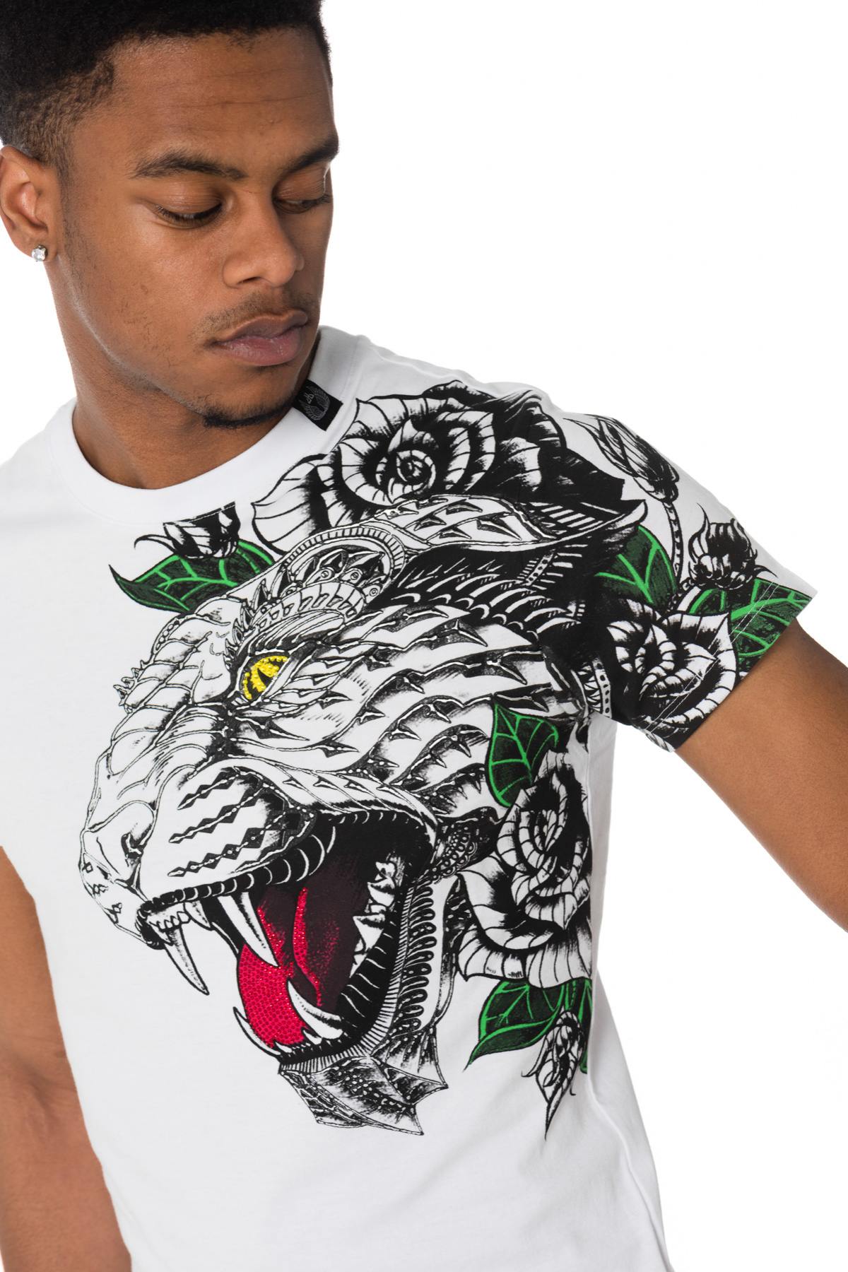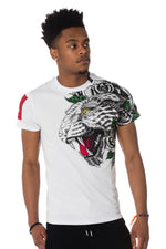 Tigerdesign på bröstet dekorerad med strass, märkeslogga på ärmen och även på kragen.