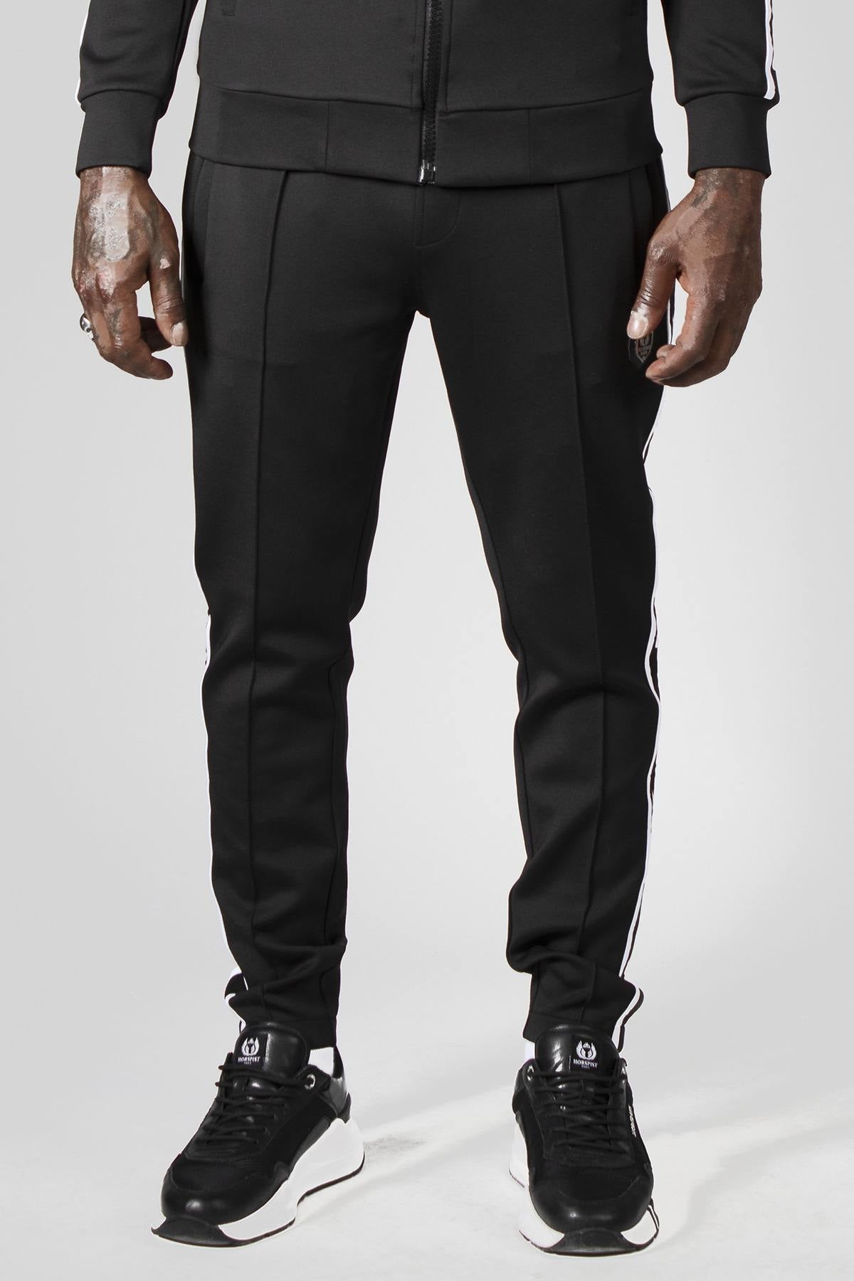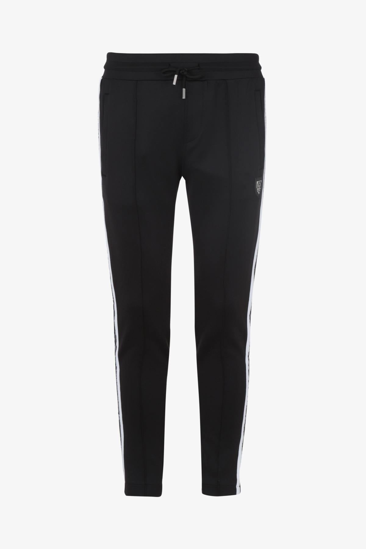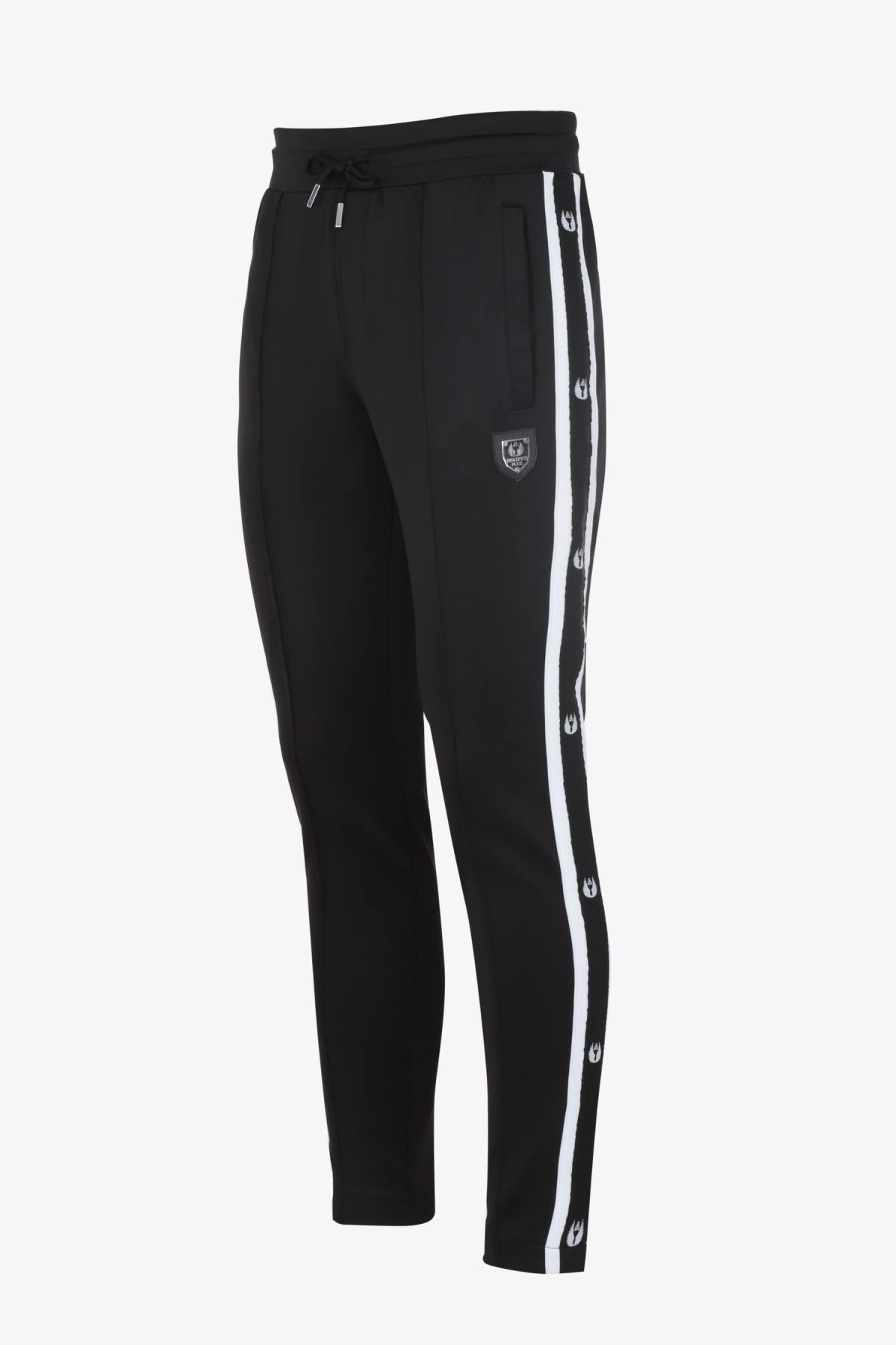 Midjan på byxorna är elastisk och har dragsko som garanterar total komfort oavsett din kroppsform. Sidorna är försedda med 2 praktiska fickor, samtidigt som det finns 2 praktiska fickor på sidorna. På baksidan dyker en sista ficka med dragkedja upp. Det vänstra låret pryds av Horspisthusets fantastiska metalliska vapen. Det högkvalitativa andningsbara stretchtyget gör det extra behagligt att bära. Han är animerade sidrandiga band som sträcker sig längs benen.