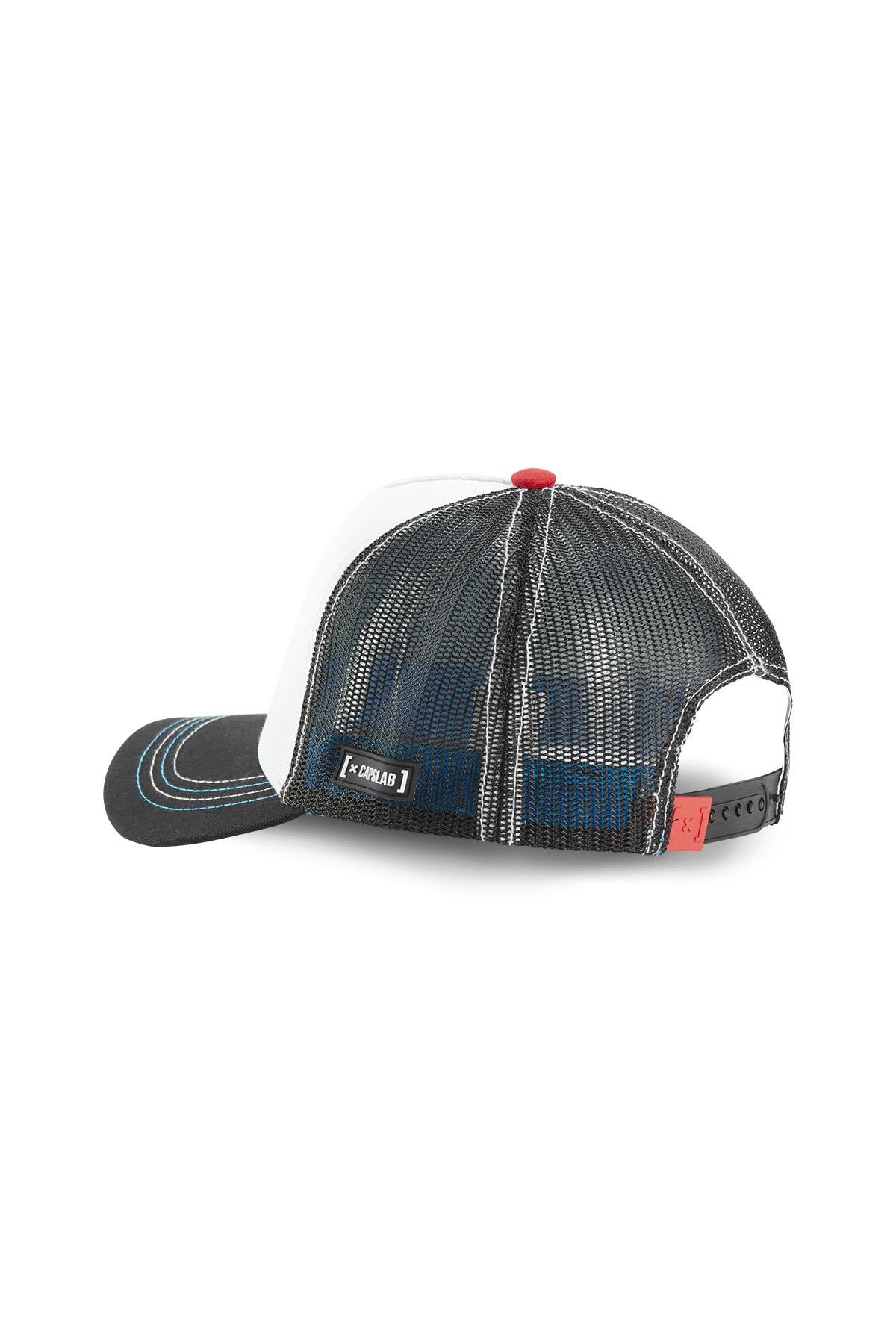 Detta är en högkvalitativ produkt. både flexibel och lätt, extremt bekväm. Den har en krona med en krona. från en vit frontpanel till bilden av en seriefigur tryckt på ett sytt ok. Det svarta kontrastvisiret är böjt i baseballstil och har enkla tvåfärgade sömmar för en trendig estetik. Baksidan i meshtextil är svart och har en logotyplapp och en snygg patch. Det klassiska snapback-låset passar alla storlekar. alla huvudstorlekar.